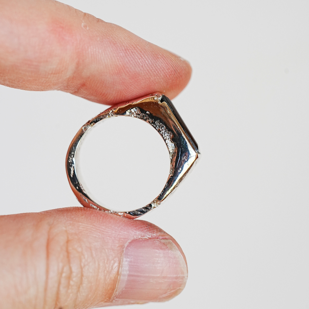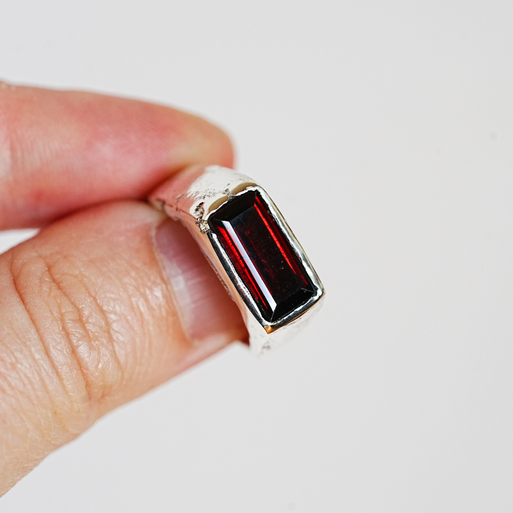 A chunky, textured signet ring featuring a garnet. The texture on this ring occurs naturally through the sand casting process, so this ring is truly unique. Handmade using recycled sterling silver by Emi in Melbourne.