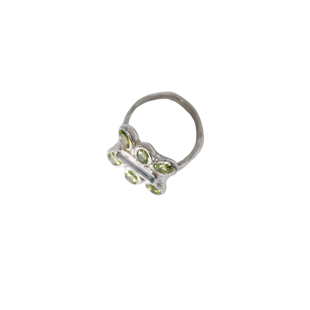 A bold statement ring that is sure to turn heads. This one of a kind ring features a pink tourmaline and six peridot stones. Handmade using recycled sterling silver by Emi in Melbourne.