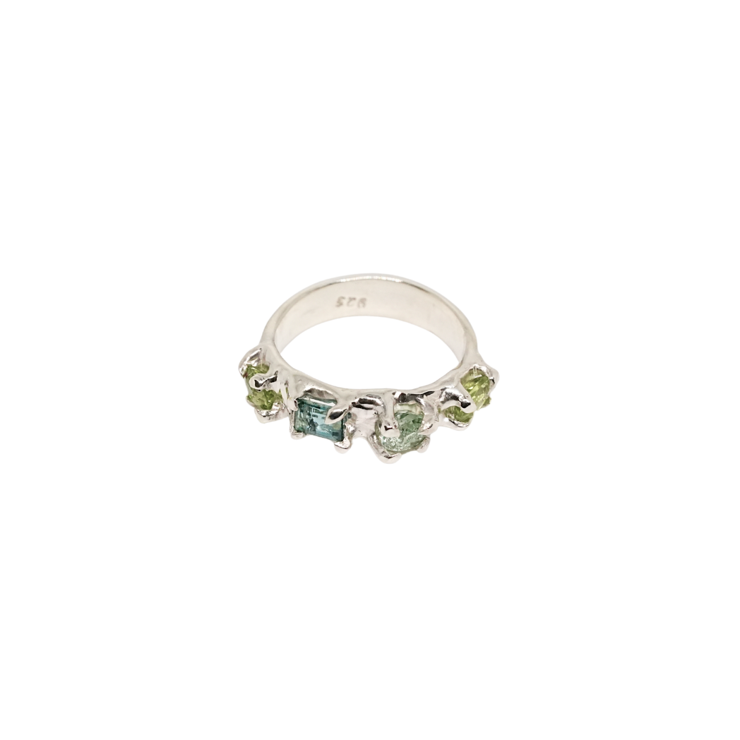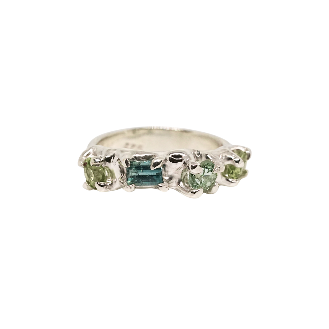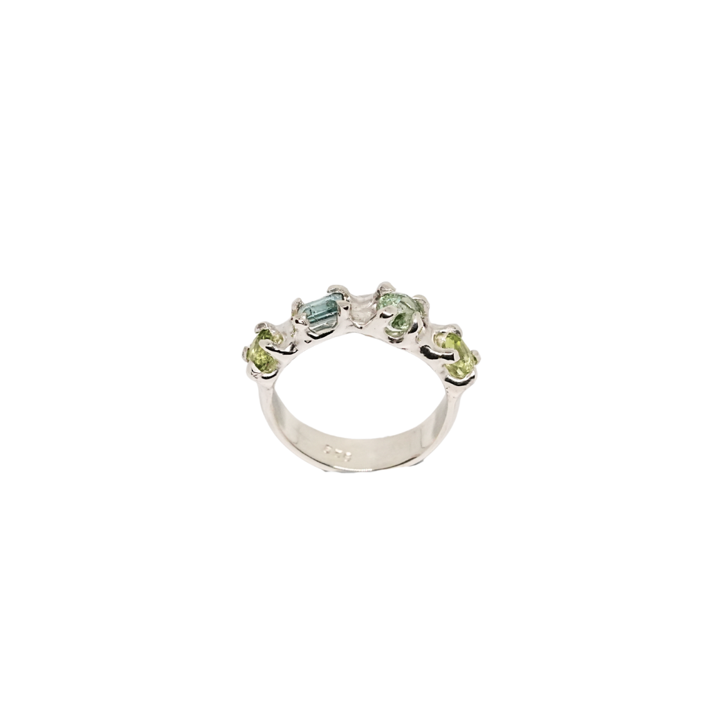 The Annapurna Ring is a one of a kind ring featuring two tourmalines and two peridot. Handmade using recycled sterling silver by Emi in Melbourne. Inspired by the shapes and colours of the Himalayas.