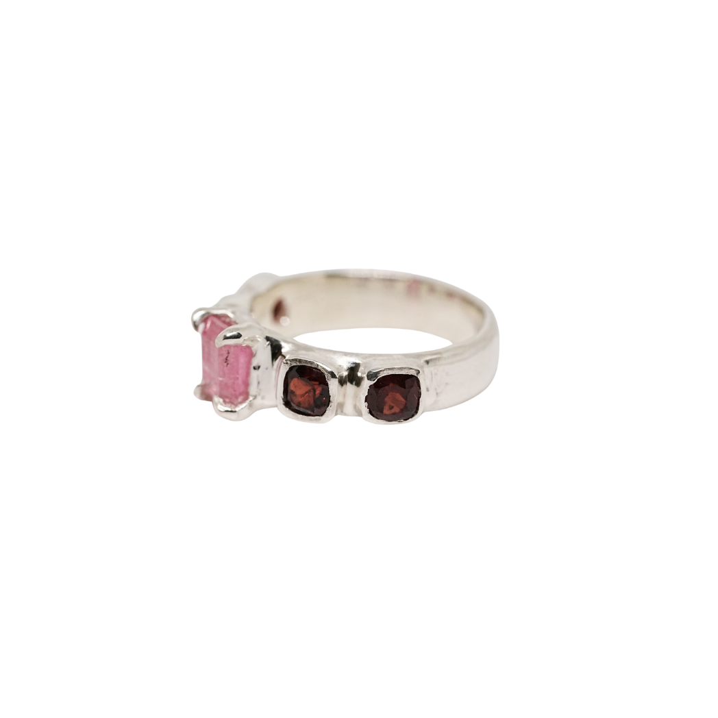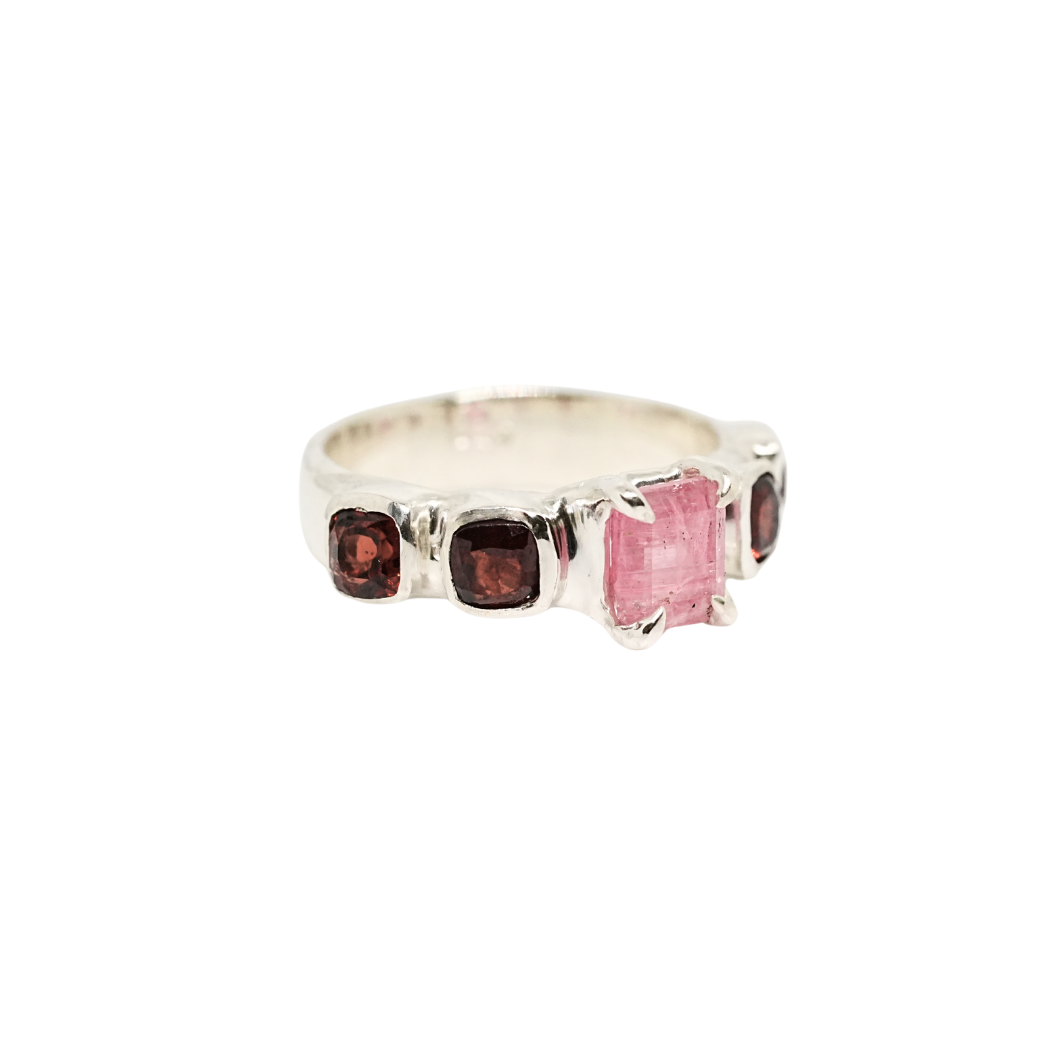 A one of a kind ring featuring a pink tourmaline and four garnets. Handmade using recycled sterling silver by Emi in Melbourne.